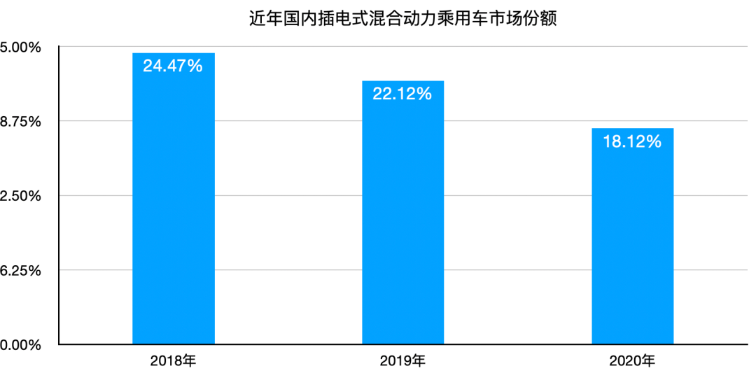 公开数据显示,在全国范围内,插混车的市场份额由2018年的24.47%已收缩至2020年约18.12%。今年1月,这一数字继续降低,约为17.72%。乘联会方面预测,到2025年,全国插混车市场份额将缩小至10%。
