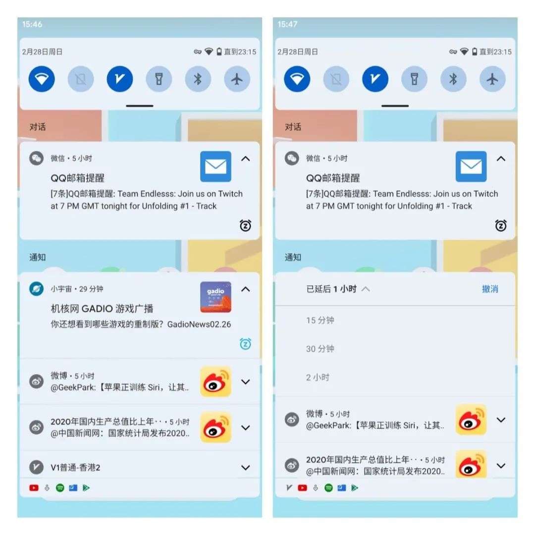 点击通知后,多了一个「通知延后」的选项,可以暂时消除通知,几小时后显示。这不是新功能,但之前需要滑动才能显示,现在更方便点击。