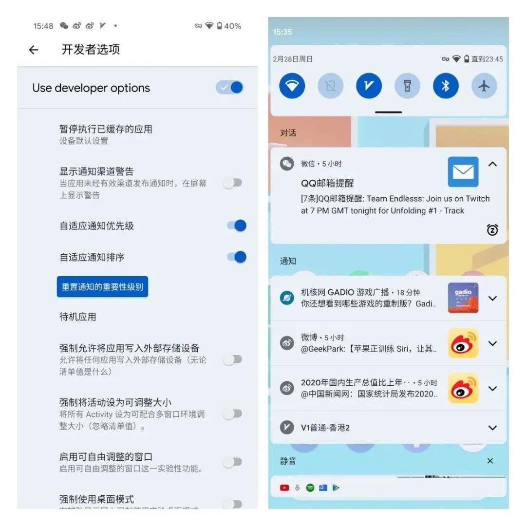 开发者选项里有自适应通知优先级和自适应通知的选项,Android 12 增加了「重置通知的重要性级别」,可以让手机重新学习自己的习惯,以更智能的方式提示通知。