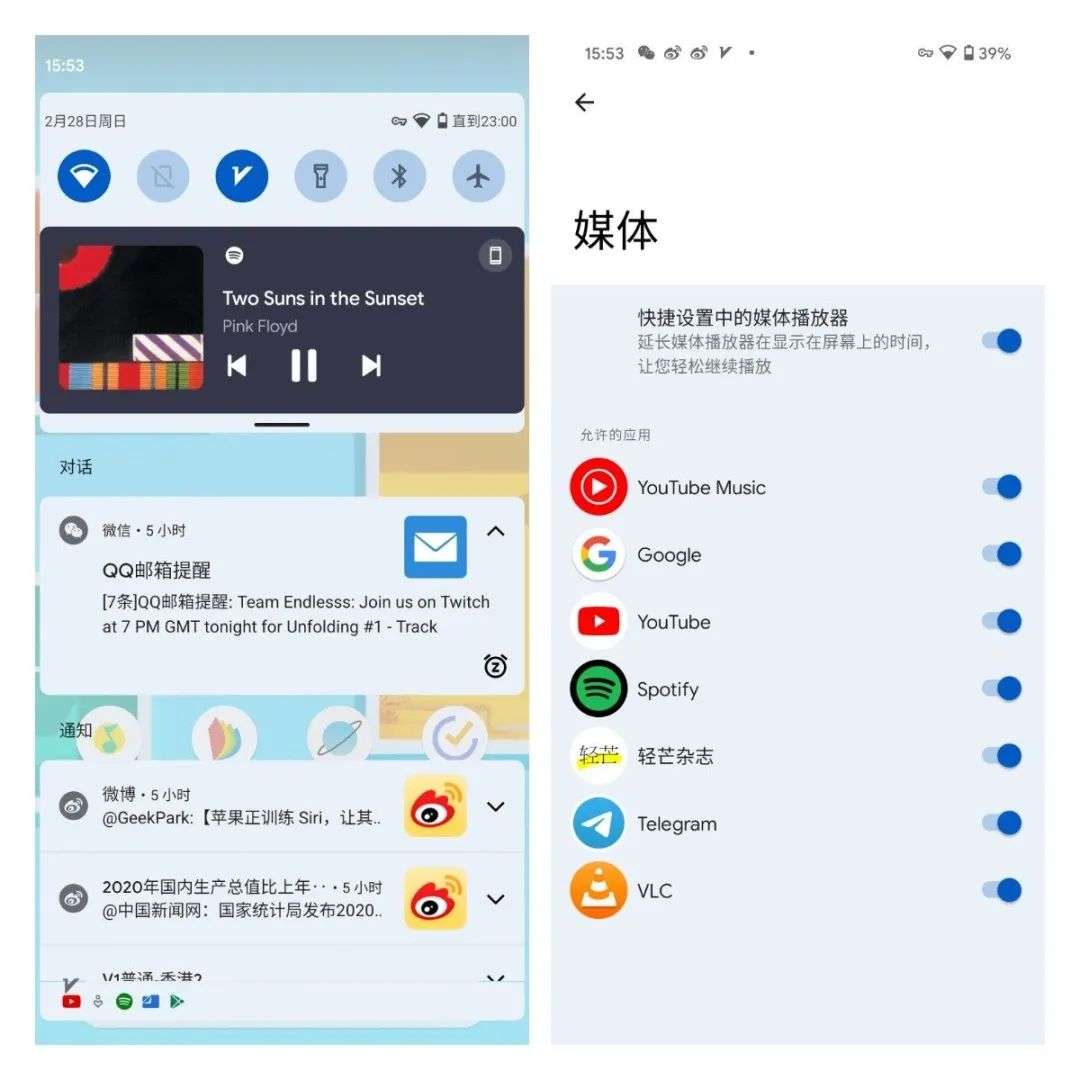 还有更多功能需要用特殊方式开启,或者只看到了代码,还无法在预览版中使用。比如新的锁屏 UI、亮度滑块、滚动截图、类似 iOS 14 的智能堆叠小组件、通知自动选项、隐私权限显示及快捷开关、背部敲击,还有就是前面所说的新主题模式