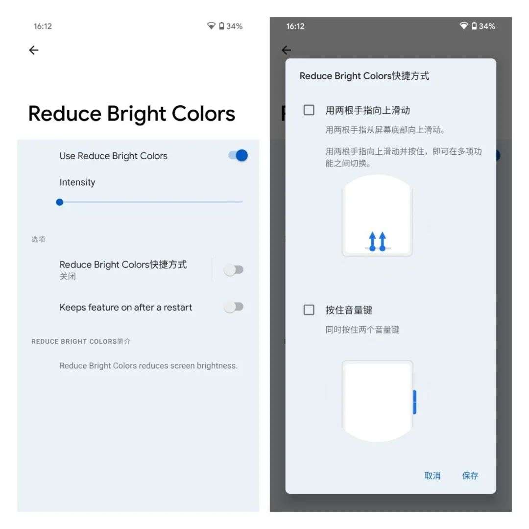 在无障碍选项中,有一个减少亮色的选项,和亮度调节类似,可以通过快捷操作触发。