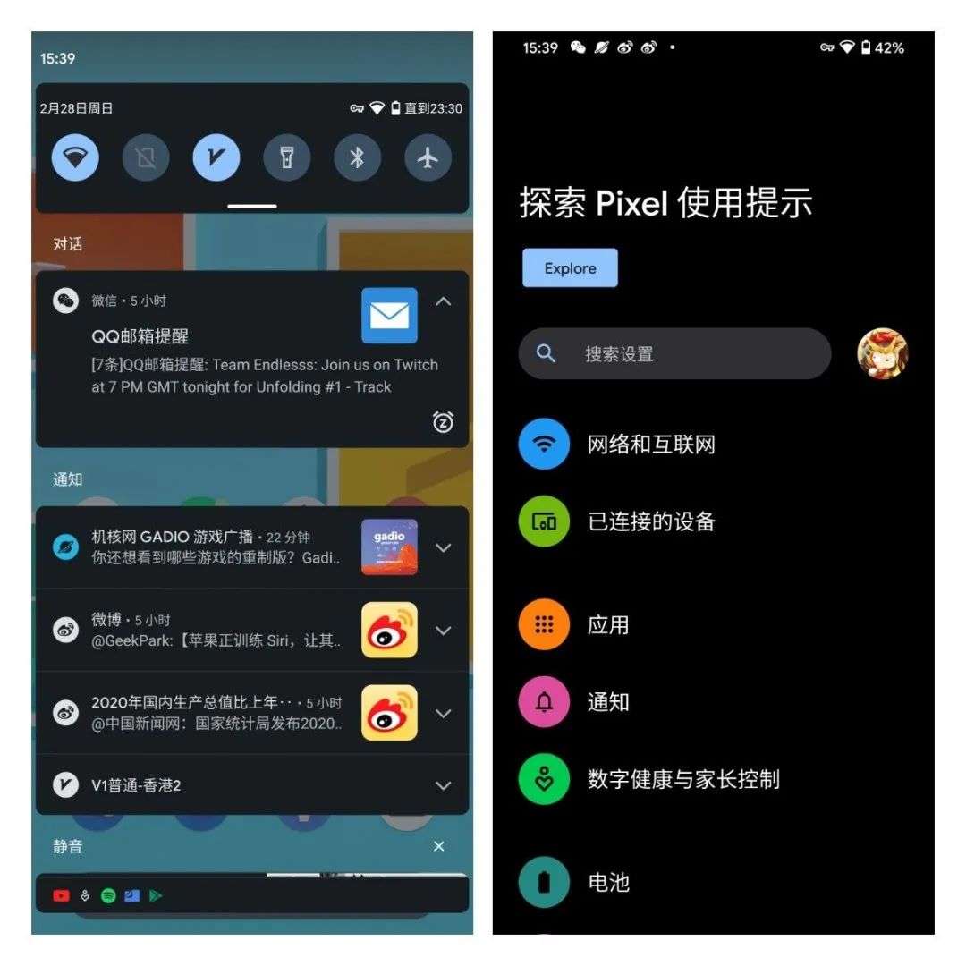 深色模式变得更偏灰了些,在快捷开关和通知栏中可以看出变化,但设置菜单里还没有变,猜测是还未完善。纯黑的背景其实观感上不一定好,很多第三方系统已经支持深色层级调整,期待 Android 12 也支持。