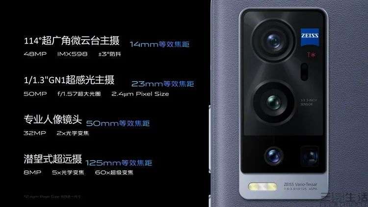 不仅如此,实际上1/1.7英寸在当今手机行业中甚至都已经“烂大街”了。对于那些真正的影像旗舰机型而言,它们所使用的CMOS通常都还要再大上一两圈。比如OPPO定制的5000万像素旗舰CMOS IMX766,就拥有1/1.56英寸大底;三星自家机皇Galaxy S21 Ultra独占的1亿像素HM3,CMOS尺寸就达到了1/1.33英寸;而vivo与蔡司联合推出的影像旗舰X60 Pro+采用的5000万像素双核对焦CMOS GN1,尺寸更是高达1/1.31英寸。