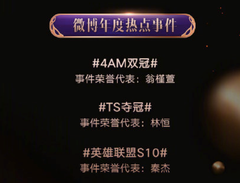 年度微博热点事件,全部是电竞相关的话题。这说明,不管外界对于电竞和游戏的争议如何,但从流量到商业变现的可能性,作为平台的微博是最有感触的。事实上,电竞和游戏的用户和粉丝们的热情一点也不逊色于饭圈,从微博热点人物到微博热点事件中出现的游戏圈中人,就可见一斑。