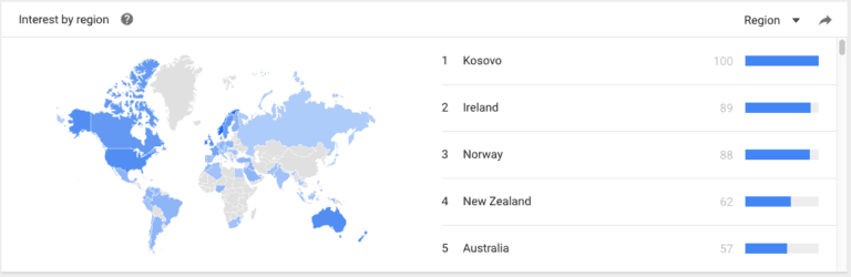 回到 Snapchat 的例子,有趣的是科索沃,冰岛,挪威和新西兰对该产品的搜索量相当高。