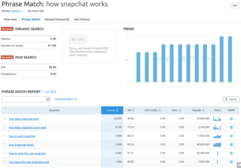 有趣的是,SEMrush 显示了更多相关的查询,比如“Snapchat 如何工作”的搜索量更多(本例中为 40,500k /月)!有些人显然不了解 Snapchat 的工作原理,当你查看这些查询的搜索结果时,很明显 Snapchat 不会为这些问题创建内容,但是它本应该这样做。
