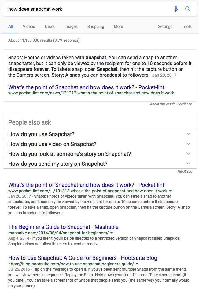 我发现人们在 Google 上搜索的众多问题之一是“Snapchat 如何运作?”这里的用户意图是了解产品。