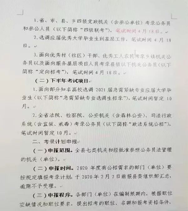 各乡镇党委,街道党工委,县委各部委,县直各部门、县属各企 事业单位党组(党委、总支、支部) 根据《关于2020年度公开考试录用公务员工作有关事项的 通知》(川组电明字(2020)3号)、《关于报送2020年度公开考 试录用公务员计划的通知》(遂组通(200)6号)要求,现就 我县2020年度公招公务员(含参照公务员法管理的工作人员, 以下简称“参公人员”)工作有关事项通知如下。关系,也就是比重的知识点。关系(一)上半年考试项目关系,也就是比重的知识点。关系1、省、市、县、乡四级党政机关《含参公单位)考录公务员 和参公人员(以下简称“四级联考”),笔试时间4月18日。关系,也就是比重的知识点。关系2、选调应届优秀大学毕业生到基层工作,笔试时间4月18日。关3、面向优秀村(社区)干部、优秀工人农民考录乡镇机关公 务员以及面向服务基层项目人员考录县级以下机关公务员(以下 简称“定向招考”),笔试时间4月18日。对于材料的分析,是很多考生在备考过程中忽略的点。对文