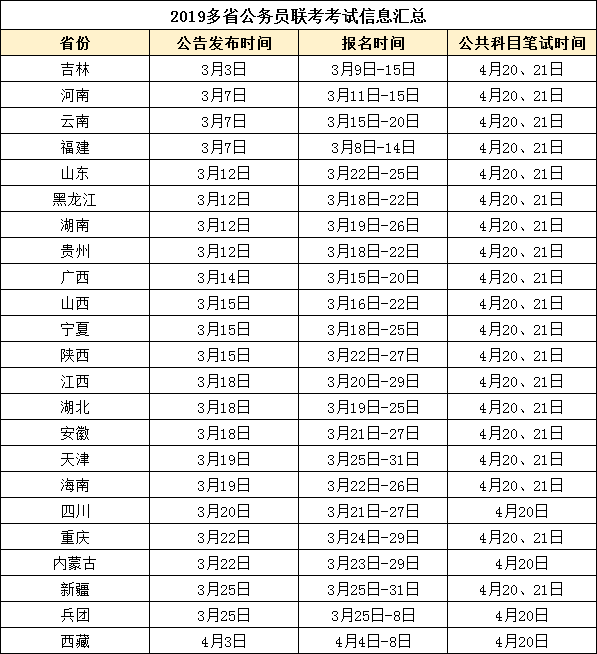 根据往年考试时间来看,贵州和其他多地省考笔试时间一致(也就是俗称的联考),如上图中所示。(2019四川考两次,此表中四川时间为上半年)从表中可以看出除了公告发布时间和报名时间不一致以外,笔试时间几乎是统一的,说明了多省公务员联考的考试性质。